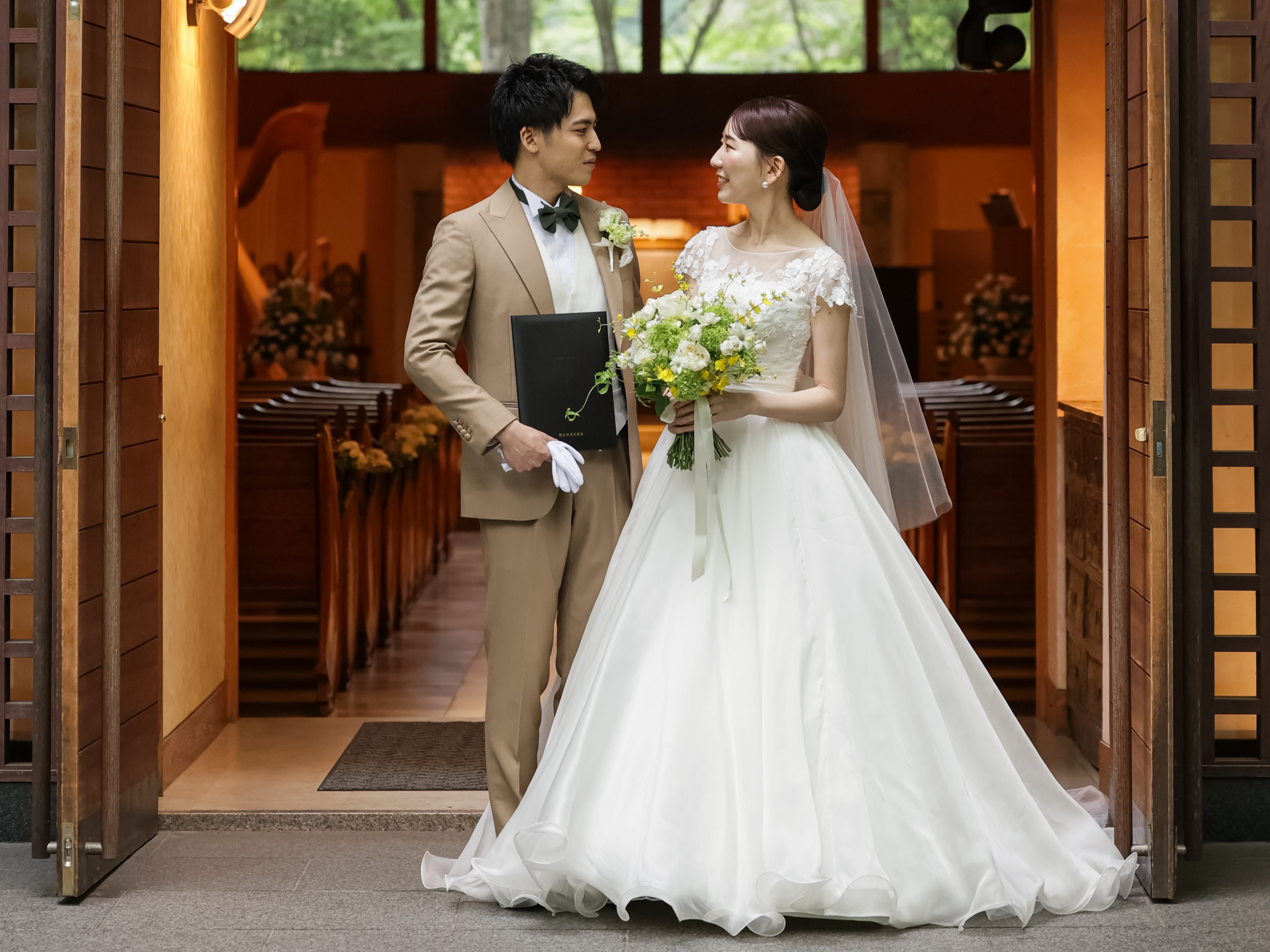 挙式は王道なボリュームのあるスカートラインに真っ白な丸みのあるラウンドブーケを持って