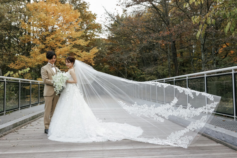 ベールはカットレースが美しいロングベールで後ろ姿まで印象的に…