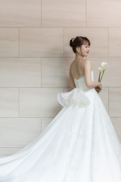 シルクオーガンジーの流れるようなコサージュがバックスタイルを彩ります
