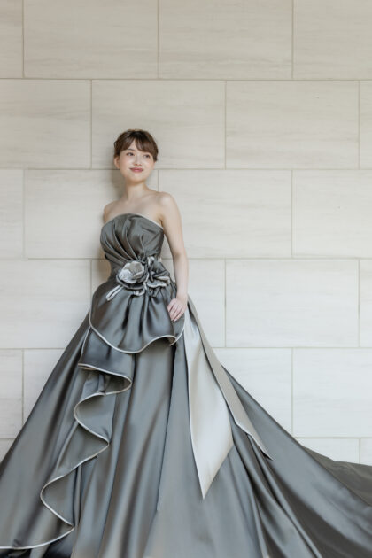 胸元に施されたドレープが柔らかな立体感を生み、上質な華やかさ漂うドレスです